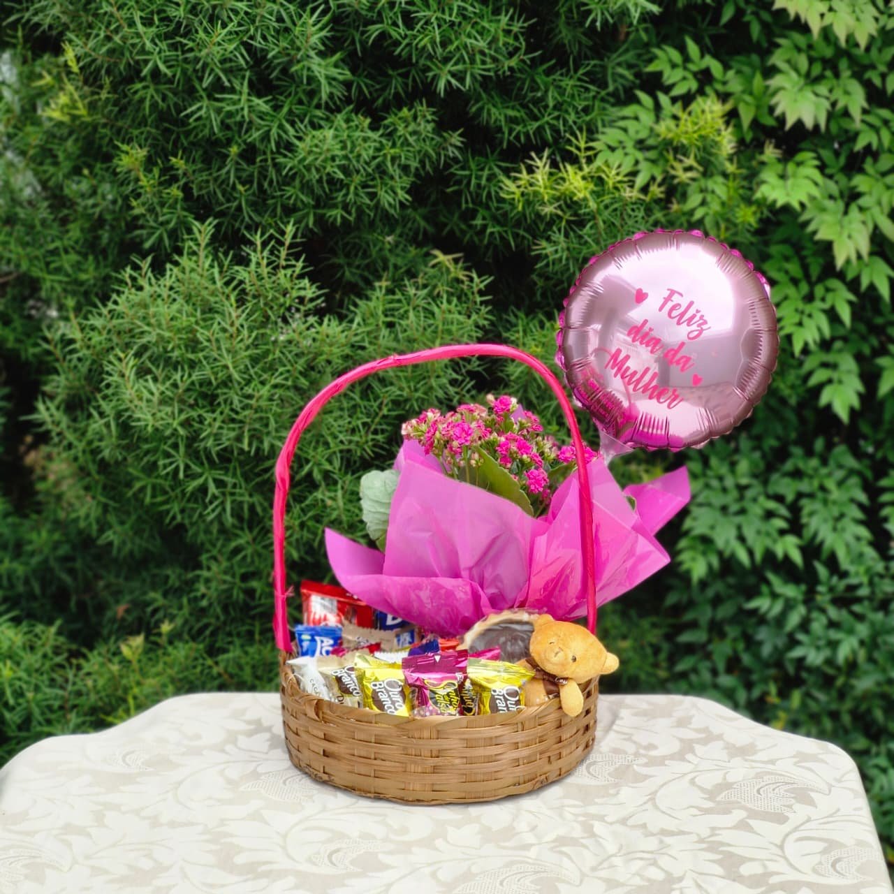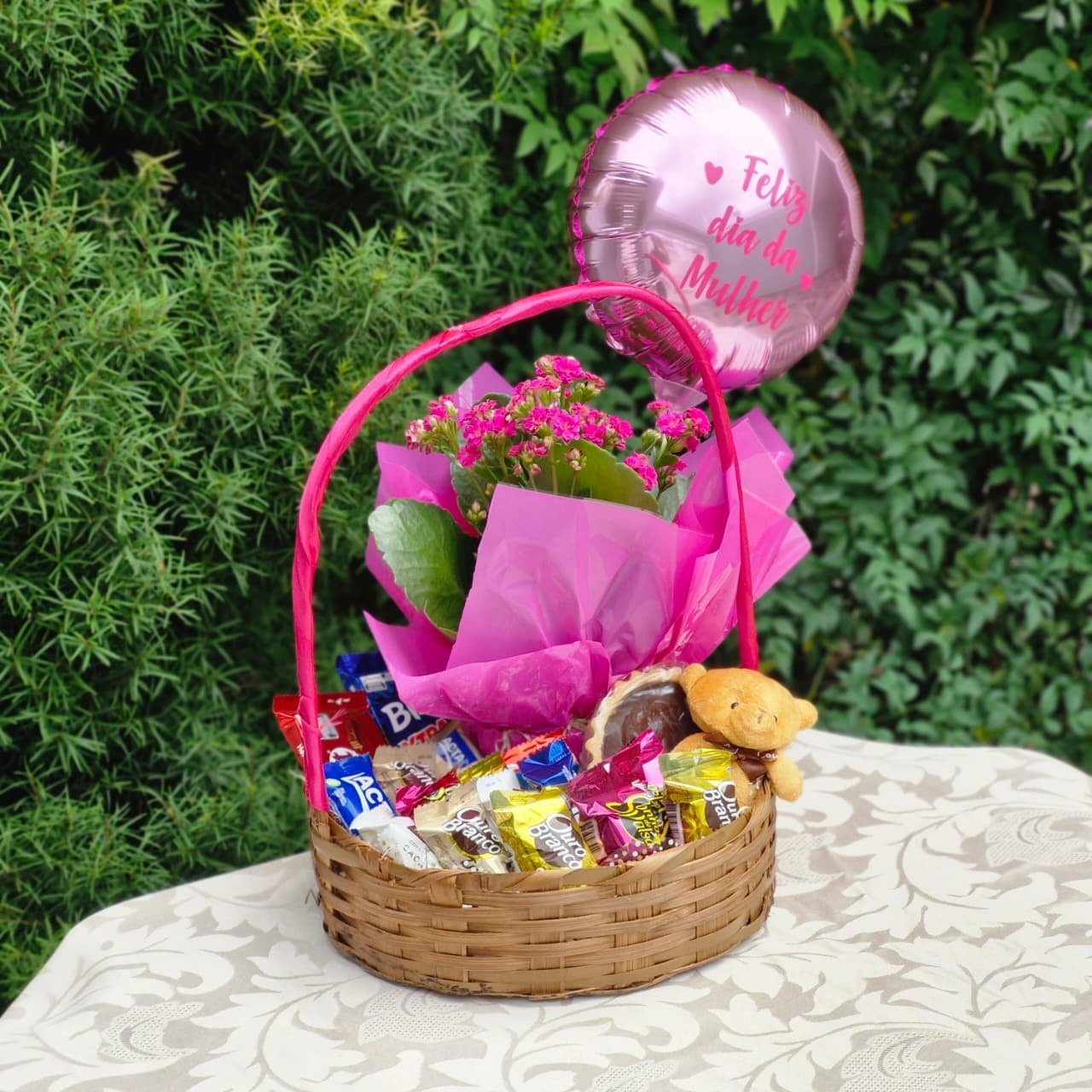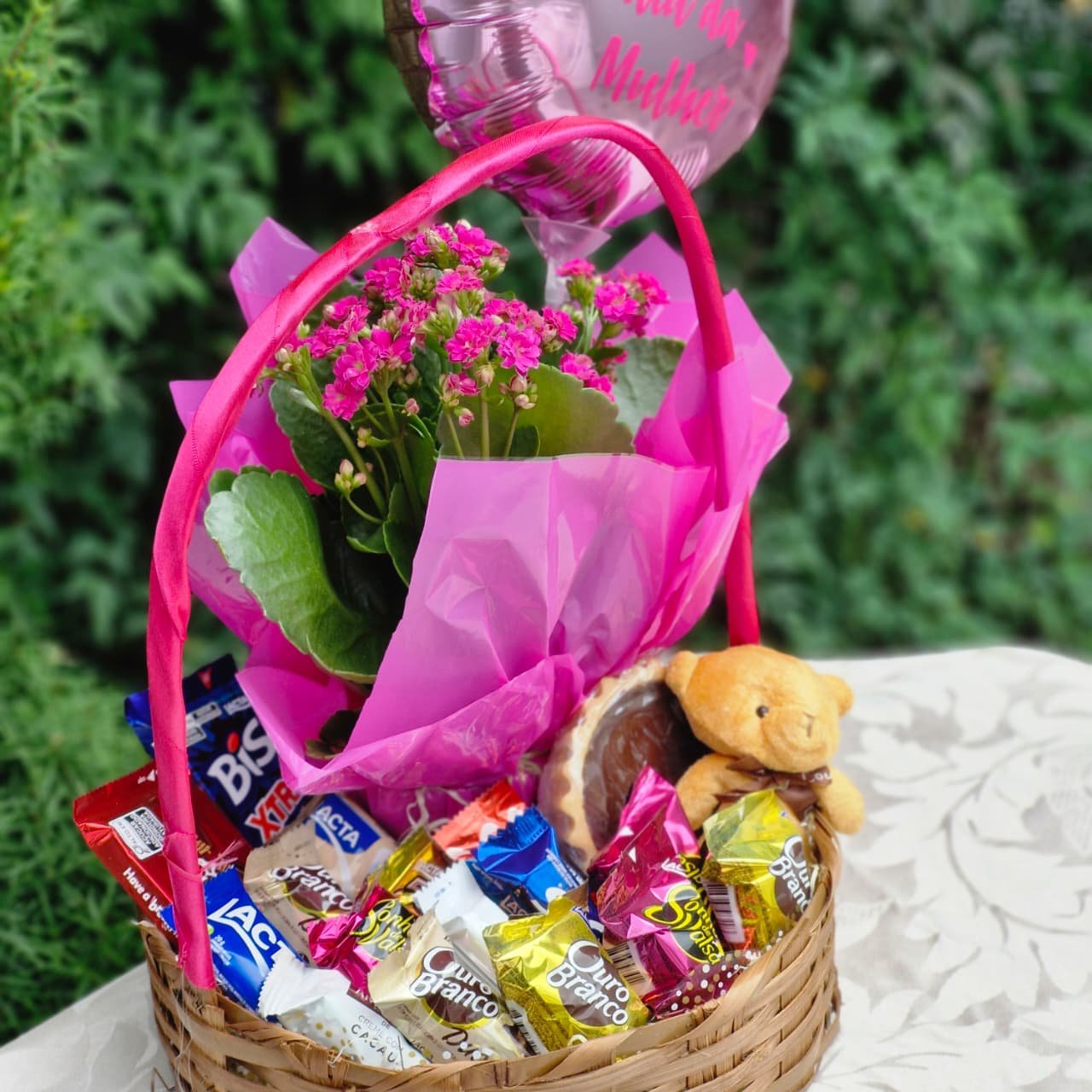 Cesta com Chocolates, Flores e Pelúcia